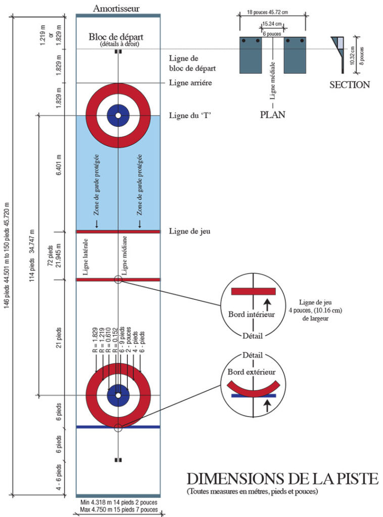 - (1) La longueur de la piste suggérée, d’un amortisseur à l’autre, sera de 146 pi (44,501 m) à 150 pi (45,720 m). La largeur de la piste, entre les deux lignes latérales, sera d’un minimum de 14 pi 2 po (4,318 m) et d’un maximum de 15 pi 7 po (4,750 m) pour les championnats. Cette surface sera encadrée par des lignes peintes ou des bandes placées autour de ce périmètre.